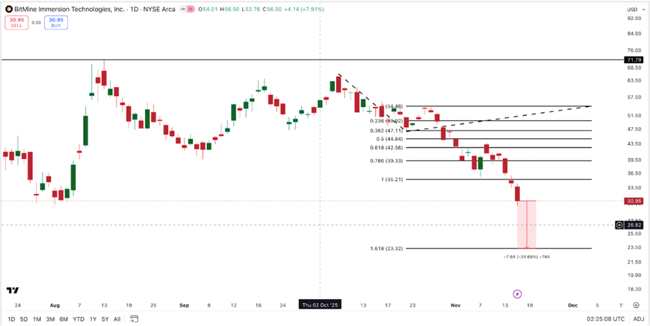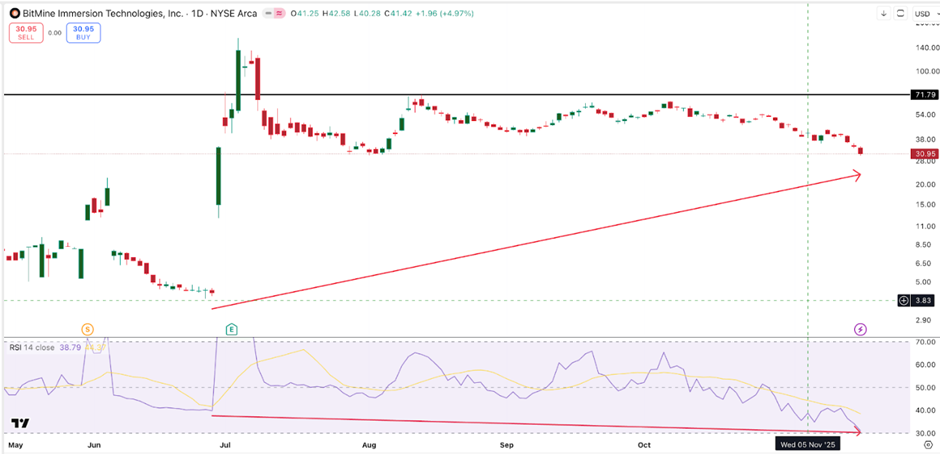 随着以太坊跌破3000美元关口,BitMine(BMNR)股价今日下跌10%,本月累计跌幅达37%。目前该股23.32美元的关键支撑位较现价低约25%。虽然RSI指标显示抛压可能放缓,但资金流疲软仍使风险居高不下。