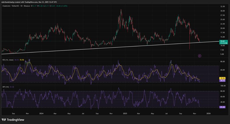 值得注意的是,周五的低位也标志着LINK价格自今年三月以来首次进入超卖区间,但这并非年内最低点——10月10日的暴跌曾使价格下探至7.9美元。此次价格调整促使LINK再次测试其长期上升支撑线。