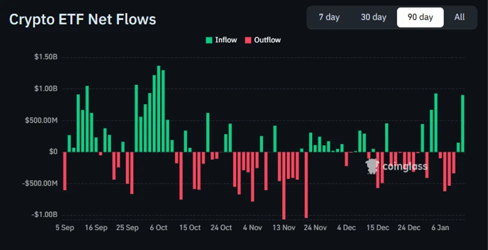 尽管最新美国PPI数据公布,加密市场多头仍保持主导地位。上周机构资金流为负,但本周ETF已出现反弹。