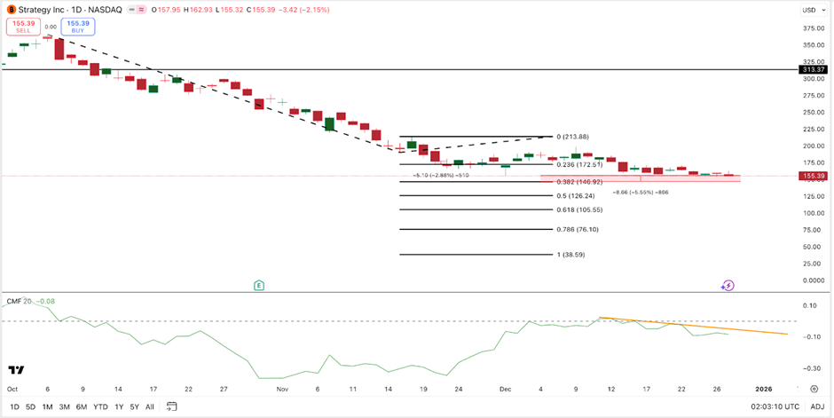 MicroStrategy(MSTR)的股价表现与比特币高度关联。过去六个月MSTR股价下跌62%,目前仅较146美元支撑位高出5%。若失守该位置,126美元和105美元将成为重要支撑区——这些正是以往市场下跌时买盘重现的关键位置。此次下跌并非偶然,既因比特币价格逼近公司平均买入价,也因机构投资者当前暂停注资。