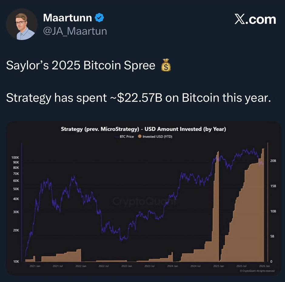 MicroStrategy在2025年累计投入225亿美元购入比特币。支持者认为若比特币创出新高,该策略将获得成功;批评者则指责公司买入过于激进且成本接近高点,加剧短期亏损。两种观点可能同时成立——长期策略或最终见效,但短期阵痛难以避免。