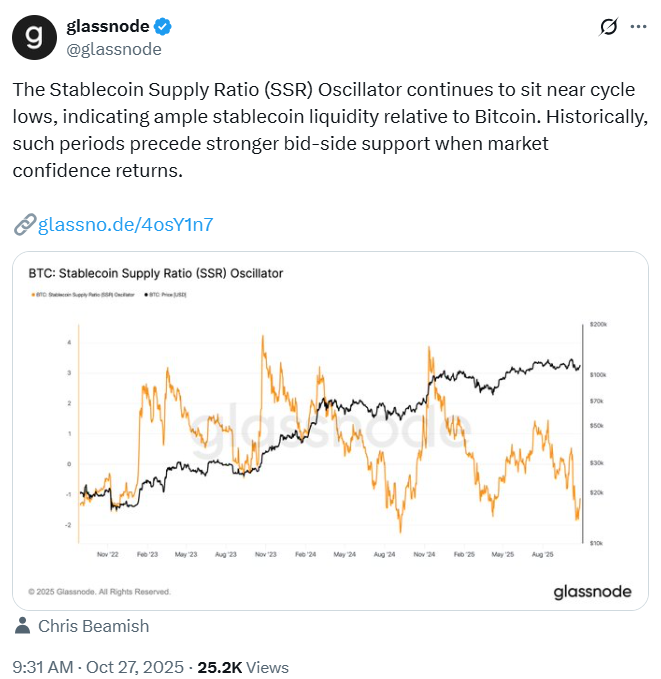在过往市场周期中,交易者常将稳定币供给比率视为信心缓慢恢复的信号。这是因为大量资金正蓄势待发,若比特币重启涨势,这些稳定币可能形成新的买盘压力,从而对冲大规模抛售。