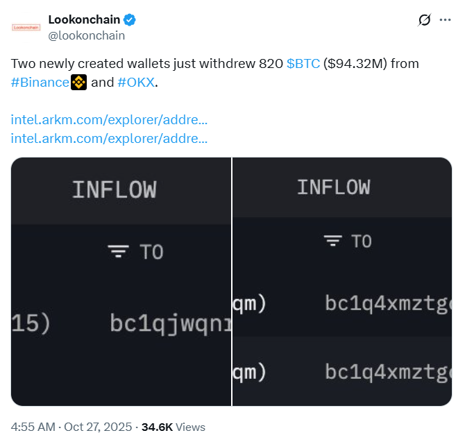 链上追踪数据显示,大额持有者活动依然活跃。Lookonchain监测到两个新创建的钱包从币安和OKX转出820枚比特币(价值9432万美元)。