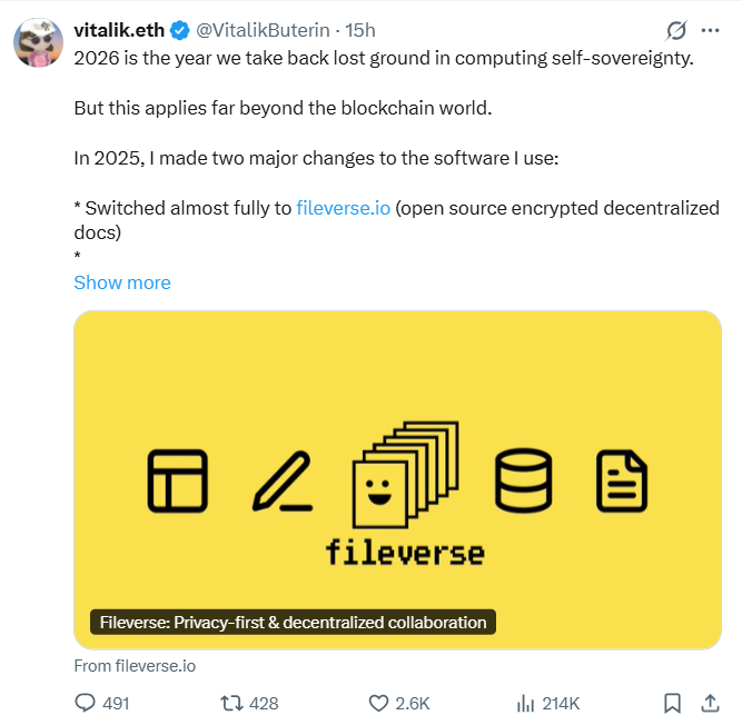 在 X 平台的一篇帖子中,Vitalik Buterin 向加密社区成员透露了他今年推动计算自主权的决定。这位以太坊联合创始人表示,他已经开始做出关键改变,例如自2025年起转而使用 Fileverse 处理文档。Fileverse 是一个开源、加密、去中心化的协作文档平台。它类似于 Google Docs,但没有中心化服务器。