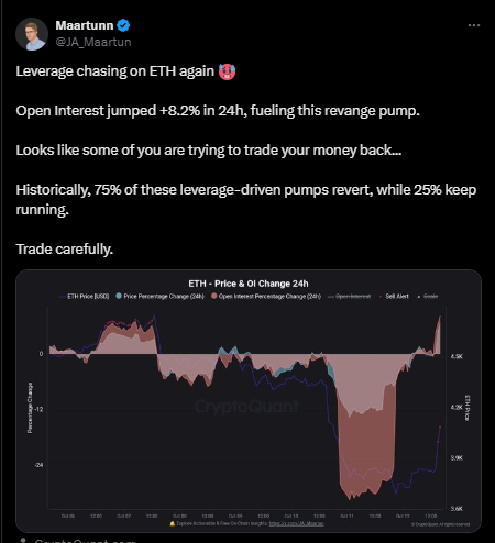 CryptoQuant分析师Maartunn表示多数杠杆驱动的反弹难以持续。他在X平台发文指出,资金费率与爆仓集群仍处于高位。"复仇交易"能准确描述当前模式——交易者试图快速挽回损失,往往催生短暂反弹。