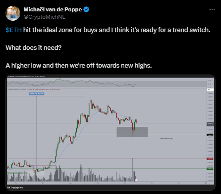 过去七周相对强弱指数(RSI)持续走低,显示动能减弱。当RSI接近50时表明多空力量平衡。MN基金首席投资官Van de Poppe认为ETH仍处于盘整阶段,他在价格预测中特别指出ETH/BTC汇率0.032附近可能成为轮动交易的买入区域。