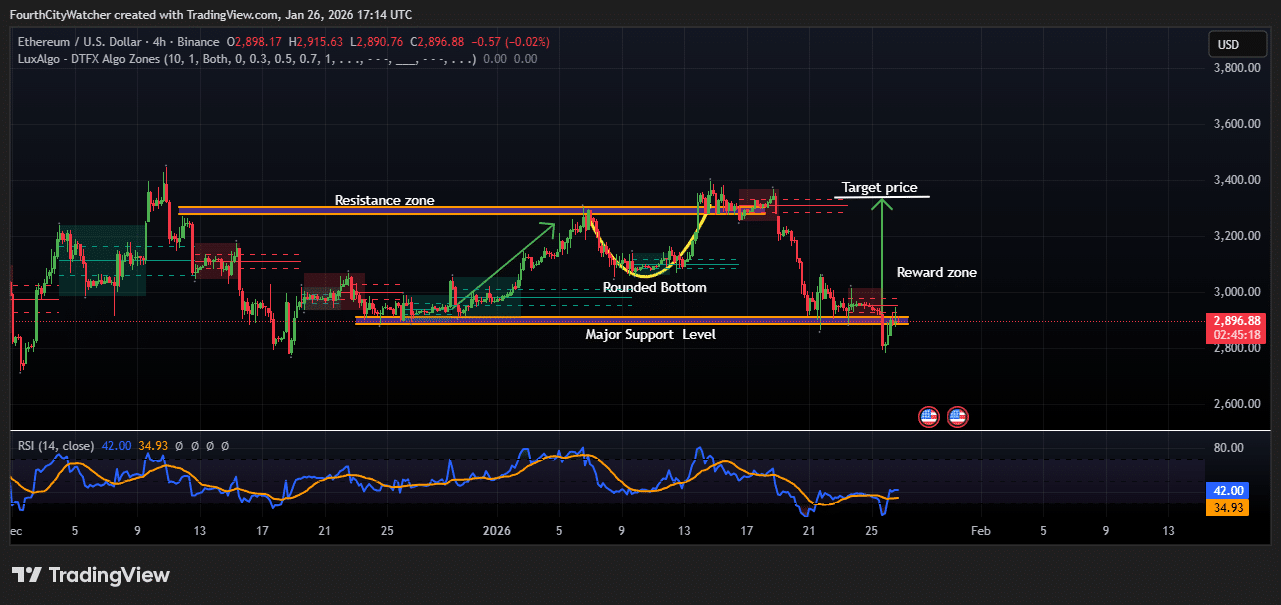 在近期跌破3000美元心理关口后,以太坊价格显现企稳迹象。图表显示ETH现报2906美元,交易者正密切关注其后续方向选择。4小时图凸显2880美元附近的关键支撑位,该位置在过去一个月多次成功防御。从此区域的反弹表明买方正在介入护盘,为短期上行创造了潜在回报空间。
