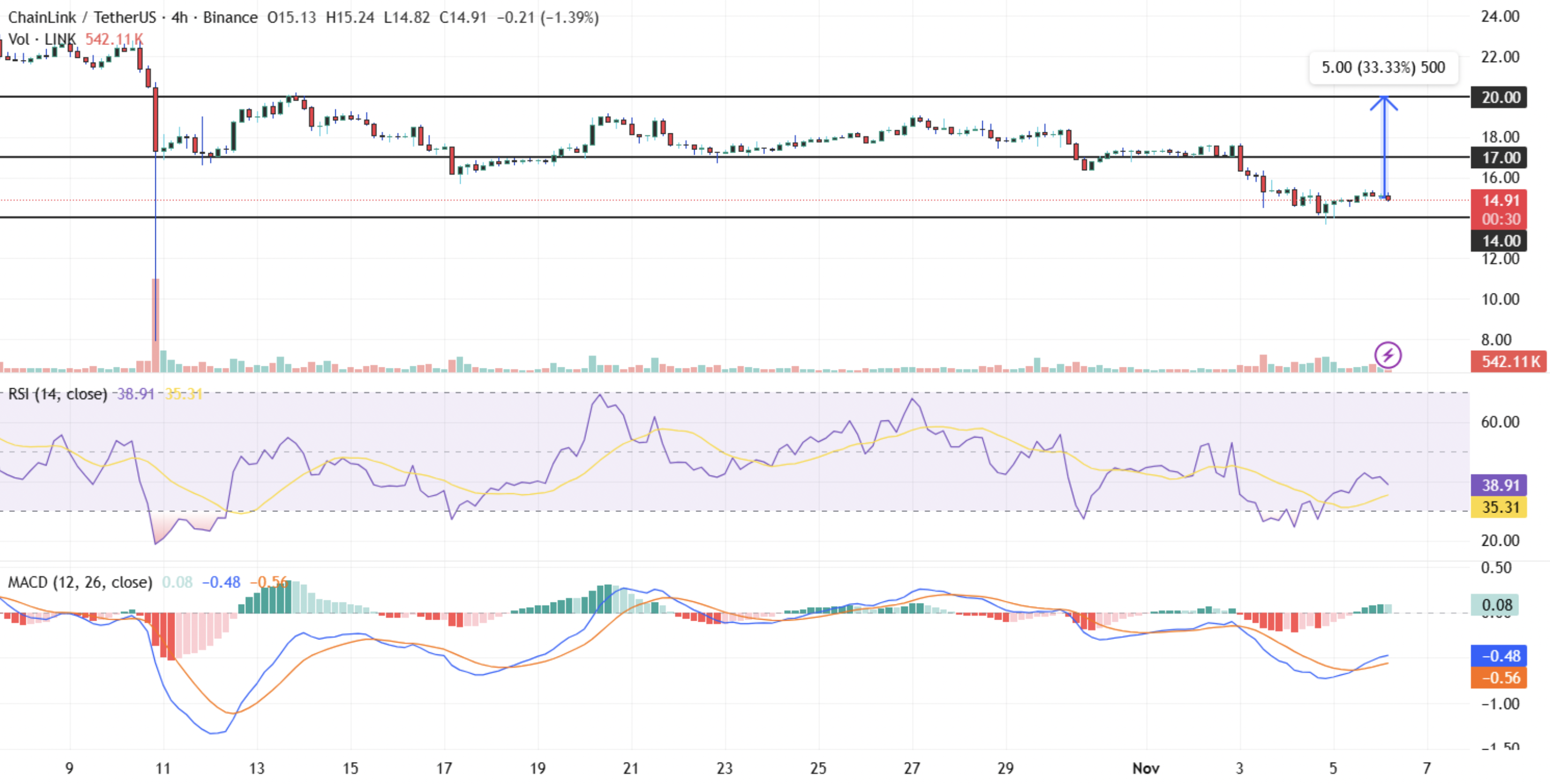 截至发稿时,Chainlink主网资产LINK代币的交易价格为14.99美元,过去24小时涨幅为1%。分析师指出,该山寨币在14美元支撑位获得动能反弹,表明投资者信心正在重建。