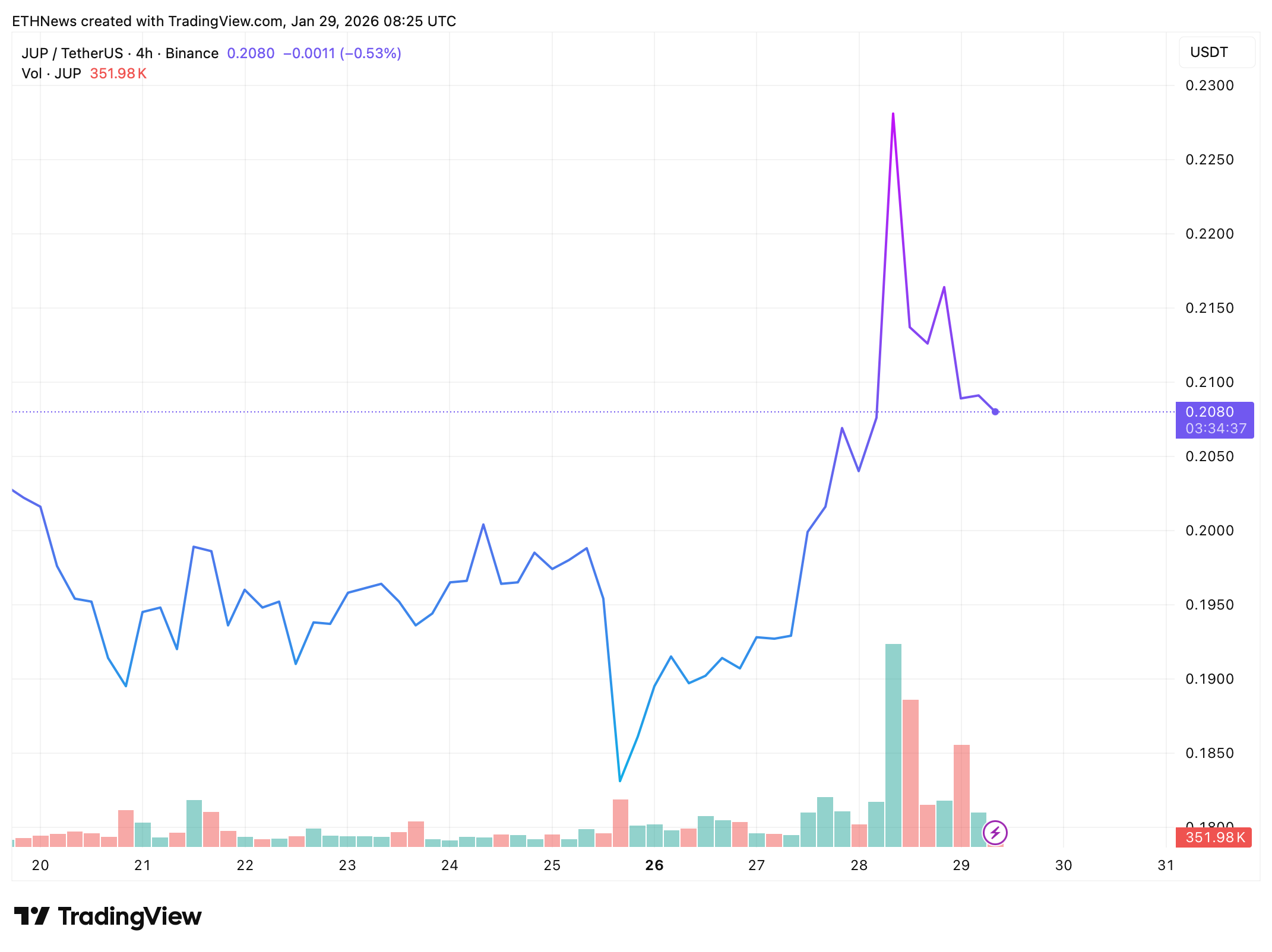 此次公告发布后,Jupiter原生代币市场反应强烈。JUP价格涨幅超过19%,一度逼近0.23美元高位,因交易者提前布局2026年1月30日最终“Jupuary”空投快照。