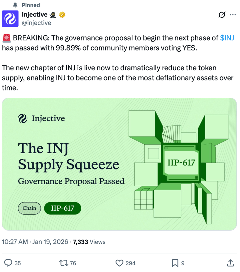 Injective在周一发布的社交媒体公告中表示,此次即时生效的治理变更将“使INJ逐渐成为通缩性最强的资产之一”。