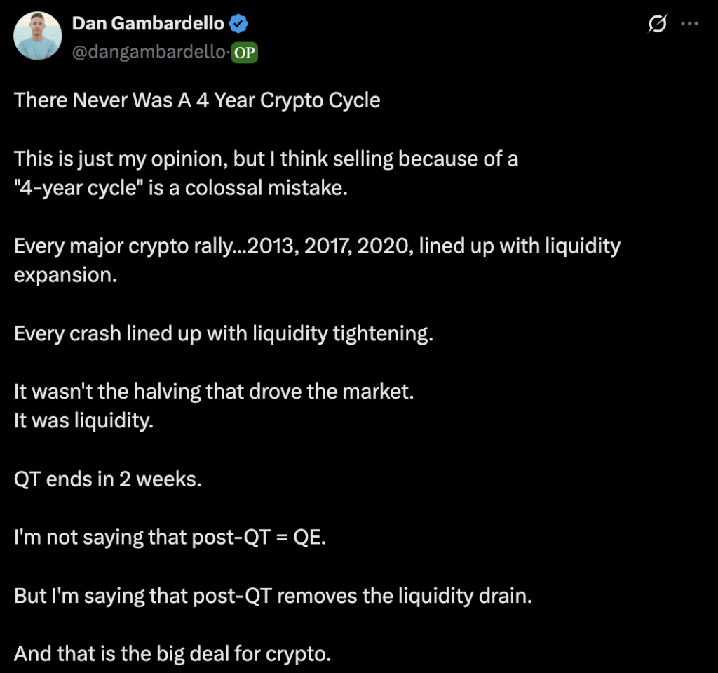 Dan Gambardello对四年周期理论提出质疑,在加密新闻领域引发热议。市场运行遵循流动性周期,而非比特币减半时间表。山寨币已完全脱离比特币减半周期。