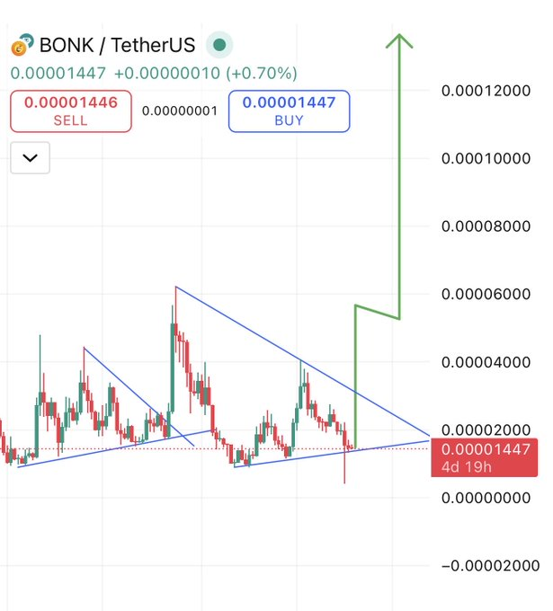今日涨幅冠军(@RoccobullboTTom)分享的BONK/USDT图表显示典型的对称三角形形态。该交易员指出BONK"正在等待突破阻力位",强调该形态可能引发剧烈单边行情。