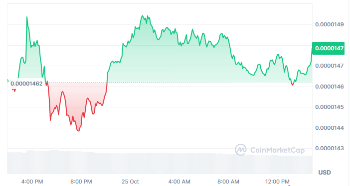 BONK短期图表显示在0.00001460至0.00001490美元区间形成有序的筹码积累。早盘短暂下探后,代币价格缓慢回升构建绿色复苏区域,显示该价位存在良好的买盘支撑。