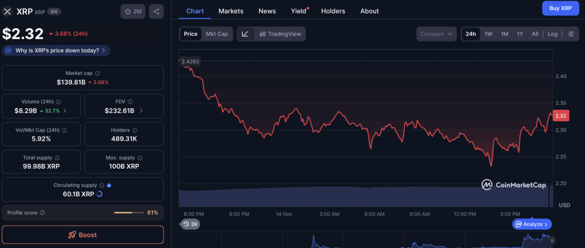 截至撰稿时,XRP报价2.32美元,24小时下跌3.71%,主要受