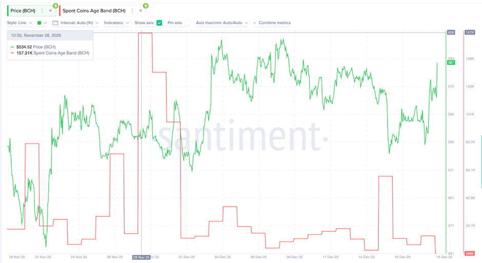 此次上涨并非发生在市场普涨行情中。比特币与大多数山寨币仍承压,这使得比特币现金的强势表现尤为突出。链上数据同时表明,这波行情并非由短期交易或情绪驱动,而是存在若干看涨指标支撑。