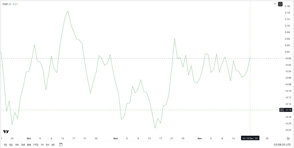 另一个支撑行情的信号来源于Chaikin资金流指标(CMF)。该指标用于判断大额买家或卖家是否占据市场主导权:当CMF持续低于零轴表明大资金流出,而升破零轴则预示大额买家入场。