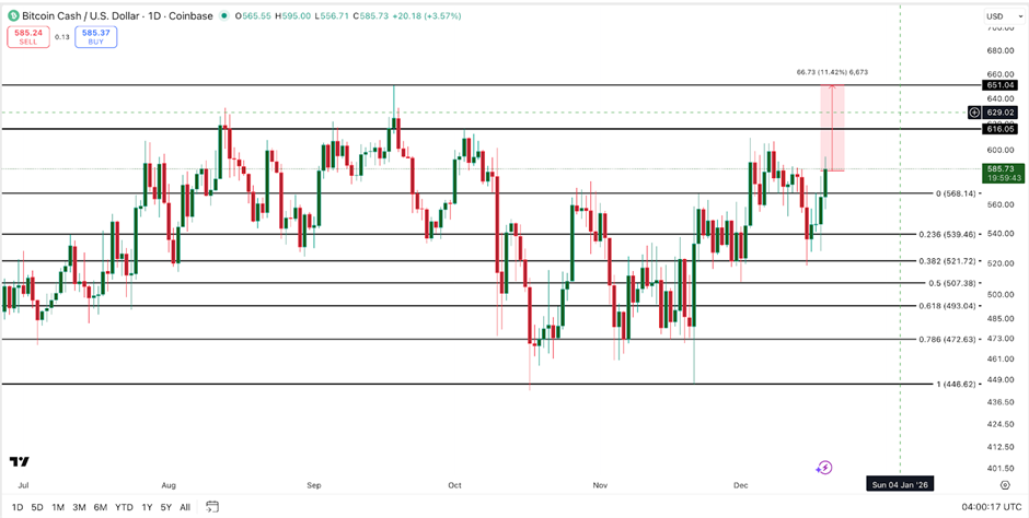 该区域历史上曾形成阻力屏障。若BCH能有效突破并站稳616美元上方,下一目标位将指向651美元附近,相当于较当前价位产生约11%的上涨空间。