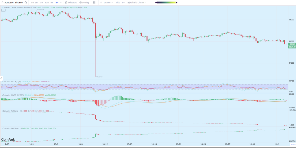4小时图RSI略高于32,反映市场看空情绪,但也暗示ADA或接近超卖区域(反弹常发于此)。MACD指标仍位于零轴下方,柱状图动能微弱,显示下跌趋势尚未完全消退。