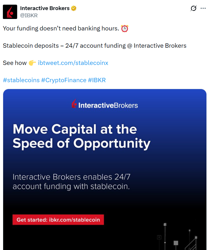 盈透证券表示,传统法币电汇跨境资金流转通常成本高昂且流程缓慢,稳定币将有效解决全球资本市场准入的这一"关键痛点"。相比之下,稳定币注资可实现近乎即时结算,兼具低成本和全天候操作的优势。
