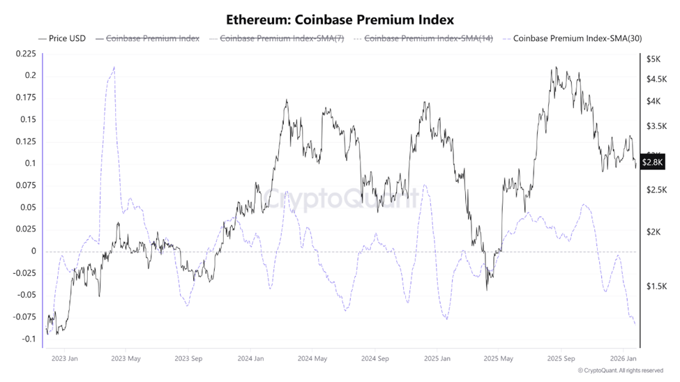 当前市场数据虽暗示抛压减弱与需求疲软,但未能完整呈现市场全貌。以太坊仍处于深度折价状态,特别是在经历2025年下半年抛压之后。以太坊Coinbase溢价指数刚跌至2023年初以来最低点,凸显巨大负溢价空间。