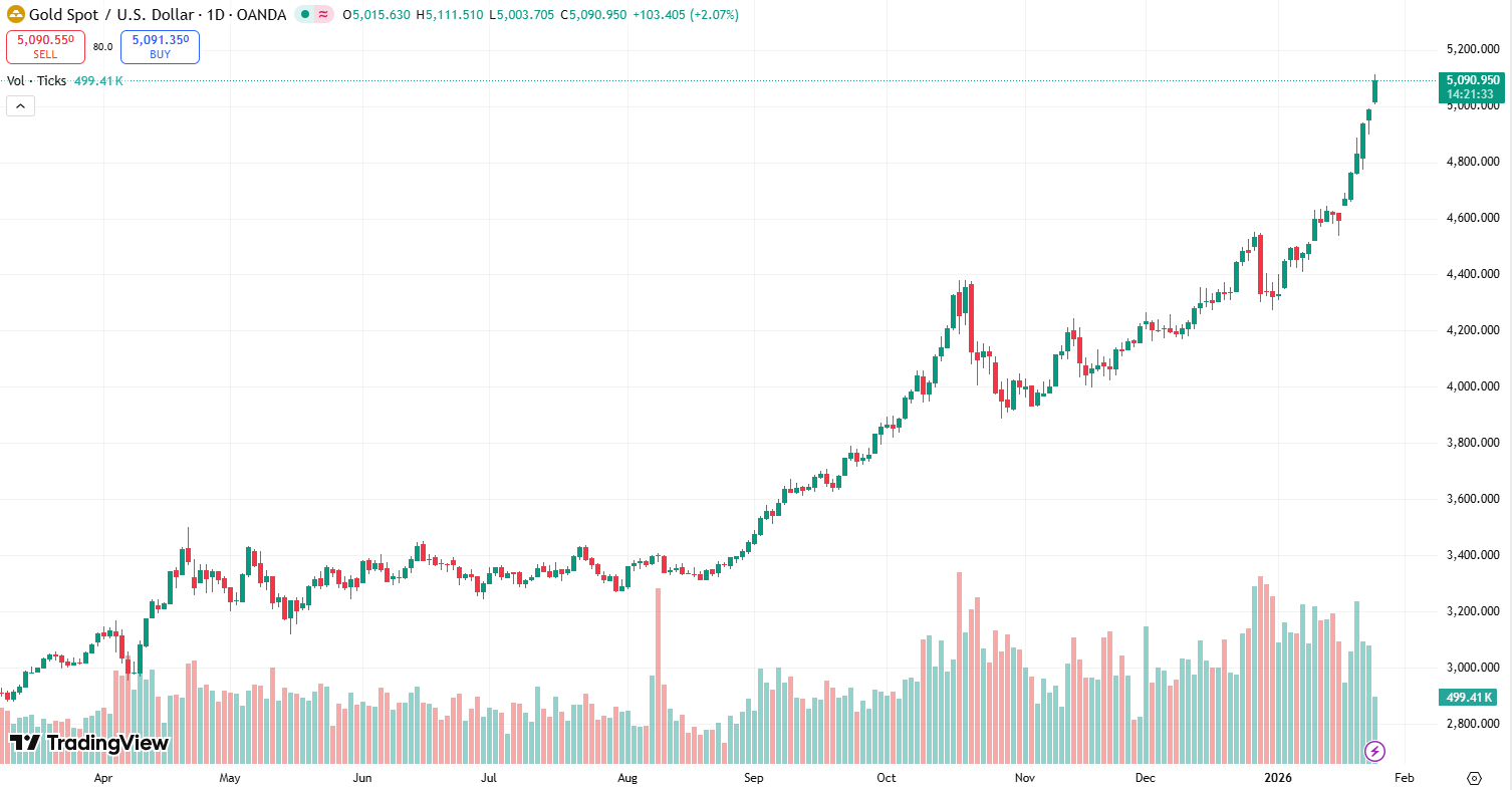 2026年1月26日,黄金创下5092.71美元/盎司的历史新高,延续了继2025年上涨60%后的涨势。三种力量解释了这一走势: