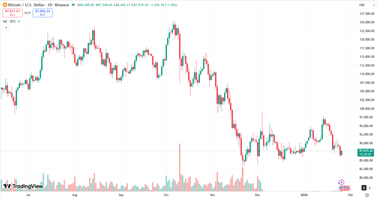 比特币在从2025年10月约126000美元的历史高点下跌后,目前交易于约87600美元,处于低信心的盘整状态。