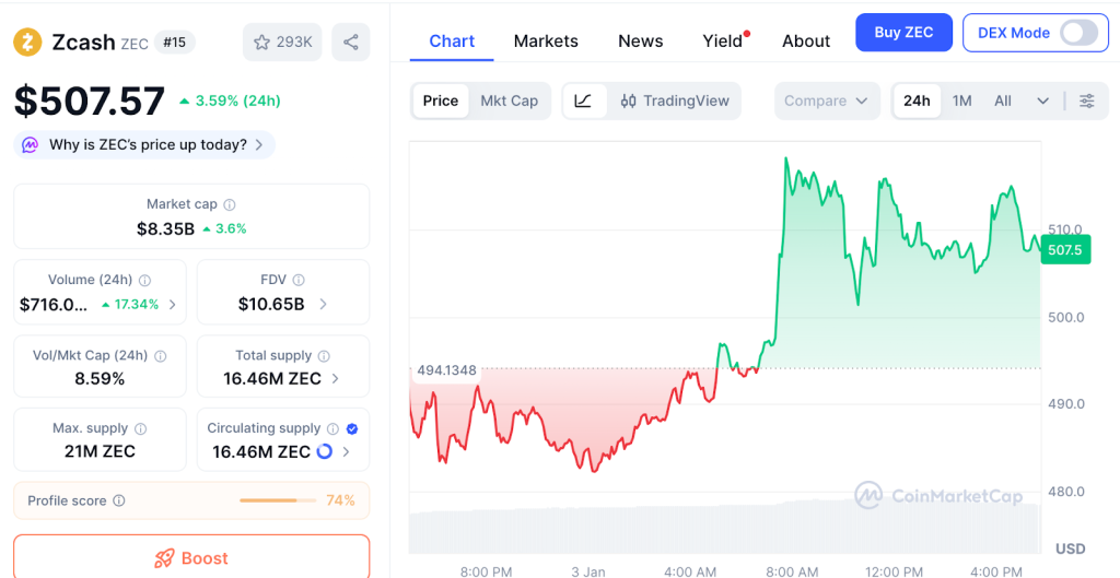 链上数据显示,某巨鲸在交易时段向币安存入74,002枚ZEC。按当前市价计算,该笔转账价值约3575万美元。此类资金流动通常备受关注,因为交易所提供直接流动性通道。