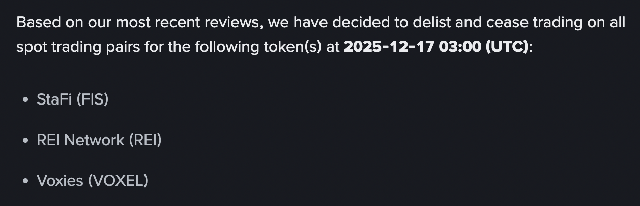 2025年12月17日,领先的加密货币交易所币安宣布下架三种山寨币:StaFi(FIS)、REI Network(REI)和Voxies(VOXEL)。该决定将终止这些代币在所有现货交易对中的交易。币安强调,此举是其通过定期评估优先保障用户保护与市场完整性的持续承诺的一部分。