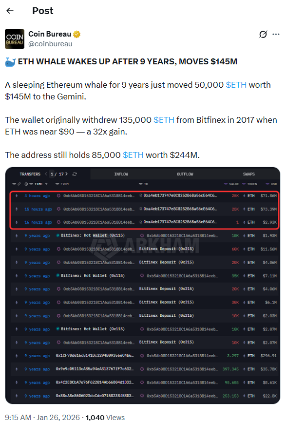 一头长期沉寂的以太坊巨鲸因在1月26日重新进入市场而引发关注。该巨鲸将价值约1.45亿美元的以太币转移至Gemini交易所。