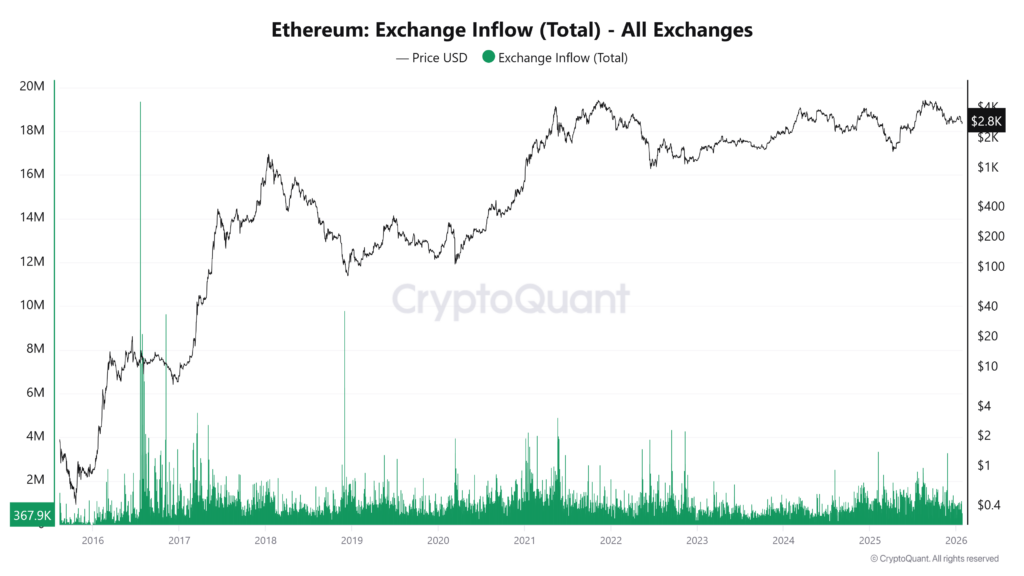 CryptoQuant数据显示,在该交易时段,以太坊交易所流入量出现明显激增。流入量的上升与巨鲸转账时间高度吻合,表明是这笔转移推动了增长。除这笔交易外,更广泛的流入活动相对有限。