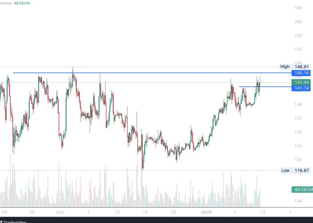 Solana (SOL) 目前展现出强劲的价格走势,其价格牢牢守住交易者密切关注的50日移动平均线(DMA)上方。该代币当前价格为141.83美元,过去24小时内上涨1.51%,日交易量超过53亿美元。