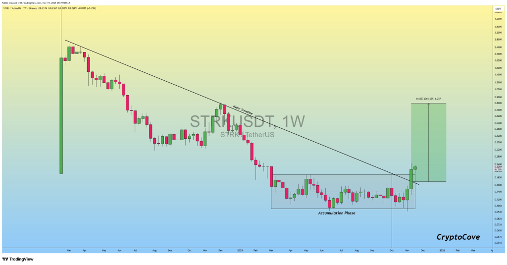 周线图表显示,STRK在结束长期下跌趋势后,于狭窄的积累区间内完成筑底。该区间形成典型的交易箱体,买卖力量在此达成平衡。最新周线蜡烛强势突破长期下降趋势线,随后价格回踩测试原阻力区域。当这个阻力位成功转化为支撑位并稳固持守时,往往预示着趋势的反转。图表分析师Captain Faibik特别强调了这种"突破-回踩"形态的关键作用。