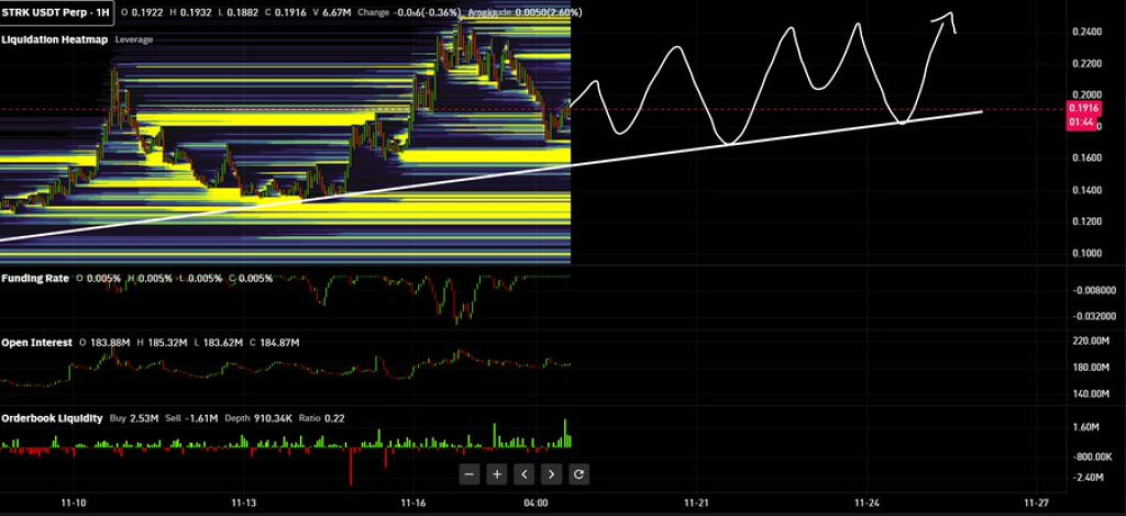 分析师BTCL2Sync通过链上数据揭示了0.18-0.20美元区间的密集买单,该区域形成类似"防护墙"的支撑结构。资金费率保持中性偏多,1.83亿美元未平仓合约显示市场参与度活跃,订单簿呈现买盘优势。这些因素虽不能保证持续上涨,但解释了STRK为何区别于其他山寨币的表现。
