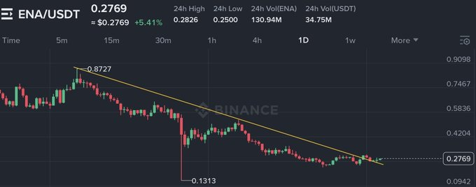 ENA在长期图表中持续受制于一条宽幅下降趋势线,自0.8727美元附近的高点以来,价格始终遵循这一结构运行。近期K线紧密贴近趋势线,显示数月有序抛售后的下行动能正在减弱。