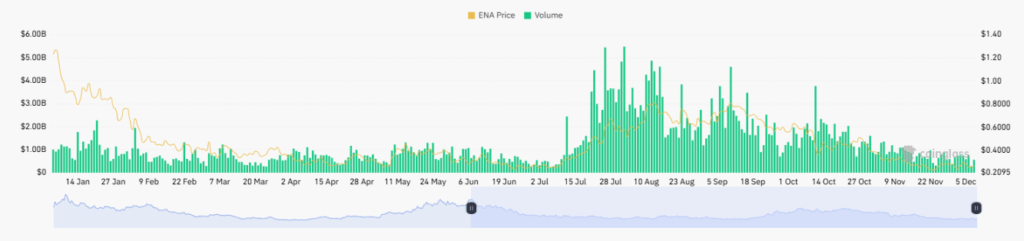 更广泛的成交量数据显示了全年交易活动的演变轨迹。ENA早期出现超40-50亿美元的极端成交量,伴随初始狂热消退。这一时期形成大量派发,推动价格走低。随后成交量在春夏持续收缩,直至7-9月再度扩张。