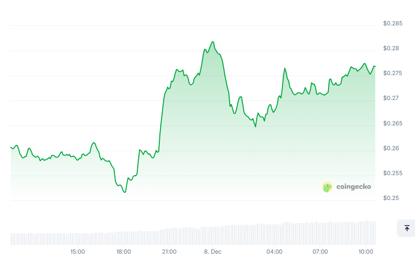 截至撰稿时,ENA交易区间为0.2516-0.2818美元。日内走势包括下探0.258美元后快速反弹至0.282美元附近高位,此次回升在0.265-0.268美元形成更高低点,构筑近期支撑基础。