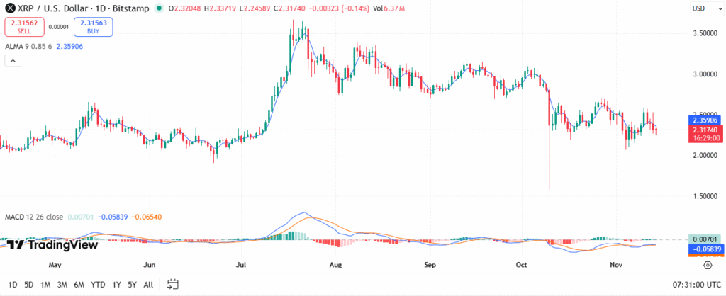 XRP价格走势显示明显波动性,特别是在XRP ETF推出后。近几周该代币在2.00至2.35美元区间震荡。当前价格正接近上升通道内的关键支撑位,该技术形态通常预示着整体上升趋势。