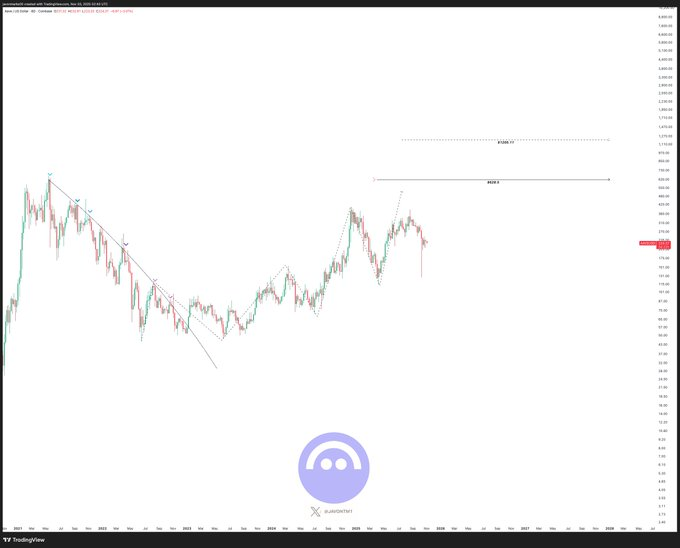 根据分析师JavonMarks分享的最新图表,AAVE当前形态显示代币可能向628.5美元位置突破,较现价潜在涨幅超177%。该分析将此目标定位为前期突破延伸行情测算运动的完成点。