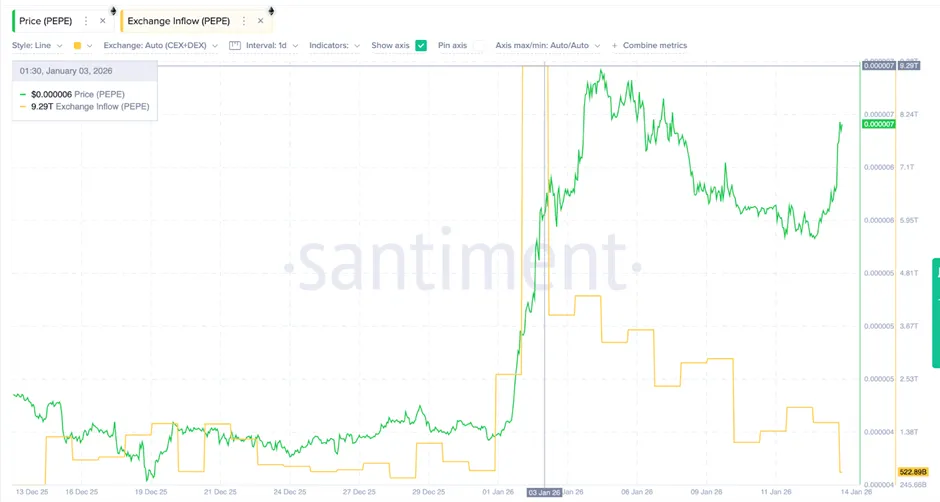 过去一个月Pepe交易所流入量急剧下降:1月3日流入量峰值达9.29万亿枚,目前已降至约5230亿枚,降幅显著。