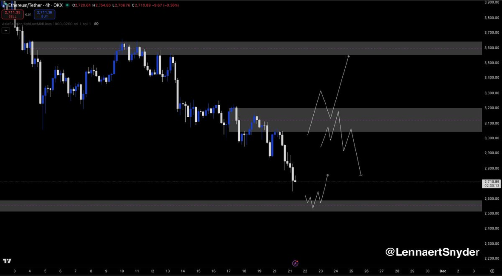 尽管当前处于下行趋势,但低位反转的可能性正吸引寻求做多的交易者关注。当价格测试这些需求区域时,分析师持续监测任何可能推动以太坊重回更高阻力位的反转信号。
