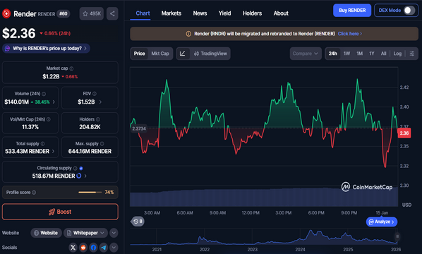 2026年1月14日,Render(RNDR)达2.38美元,实现连续1.5%日涨幅。此轮上涨基于1月12日强劲突破至2.57美元的12%涨势,该资产已成功将2美元水平转化为坚实支撑。其市值现达12.4亿美元,全球排名第90位,近期拉升中近2.51亿美元的高交易量为买盘信心提供支撑。在印度,该代币稳定交易于217至222卢比之间。