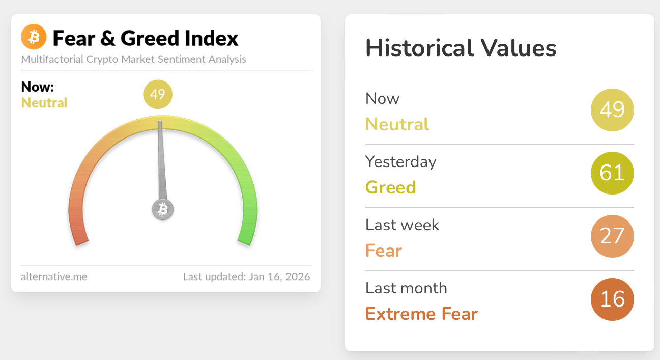 追踪市场情绪的加密货币恐惧与贪婪指数在周五下滑12点至49(满分100),进入“中性”区间,而周四该指数为61,处于“贪婪”区域。周四的指数是自10月10日(当日加密市场暴跌并引发190亿美元清算)录得64分以来的最高水平。