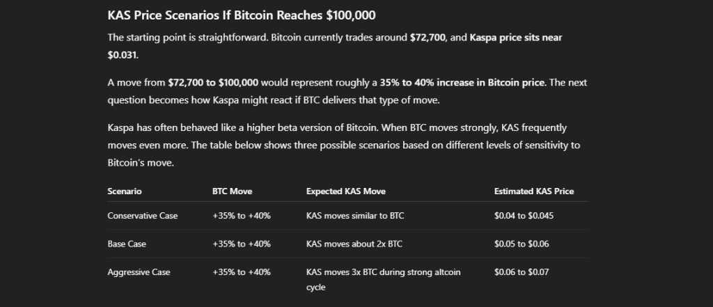 当前的参照点很明确:比特币价格约72,700美元,Kaspa交易于0.031美元附近。若比特币从72,700美元升至10万美元,意味着涨幅约为35%至40%。