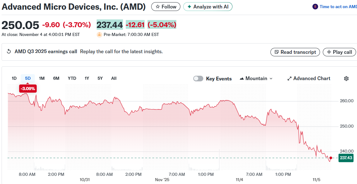 尽管业绩亮眼,AMD股价在盘前交易中下跌近5%。