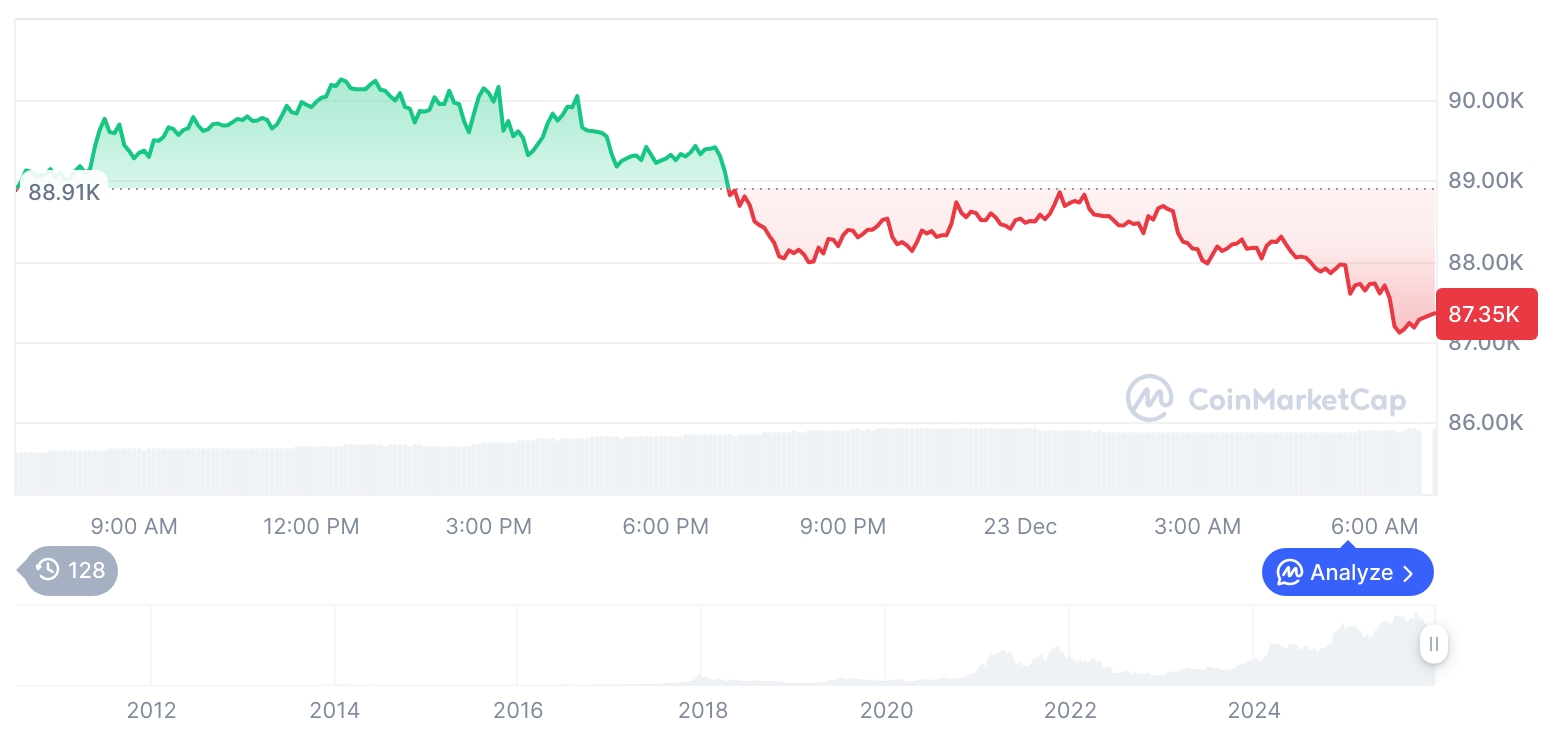 当前比特币报价88,452.79美元,市值达1.77万亿美元,占据58.99%的市场主导地位。24小时交易量达到359.8亿美元,同期微跌0.77%。近期价格表现包括7日内上涨3.11%。