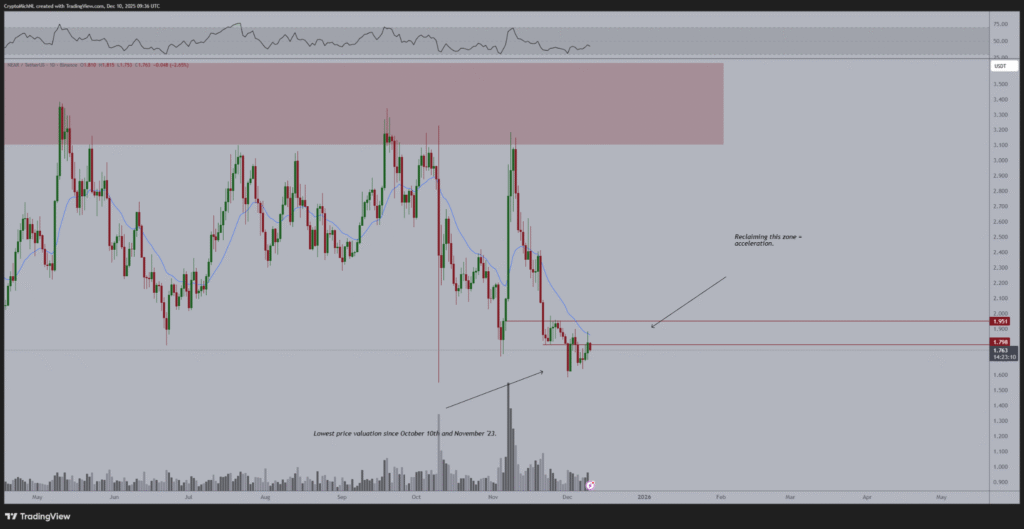 NEAR在更高价位仍面临显著阻力。分析师强调,若价格未能收复关键阻力区,可能持续承受压缩走势。Van de Poppe指出,这种情况可能持续到多头积蓄足够力量再次挑战阻力位。