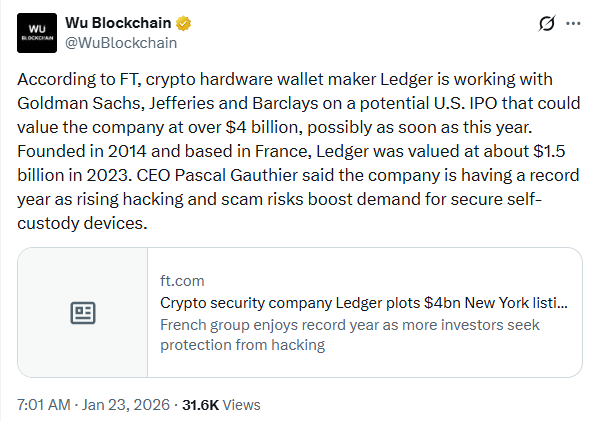 Ledger探索在美国上市的计划,清晰地揭示了加密货币公司如今如何看待长期资金来源。这家总部位于巴黎的硬件钱包制造商正与高盛、杰富瑞和巴克莱银行合作,筹划一项潜在的IPO,其估值可能超过40亿美元。