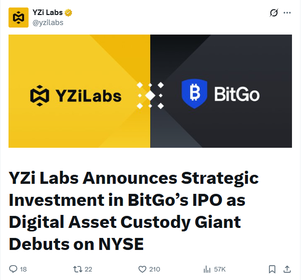 YZi Labs确认对BitGo的IPO进行了战略投资。该公司表示,其支持的是能够承载下一波机构资本进入加密货币领域的受监管基础设施。