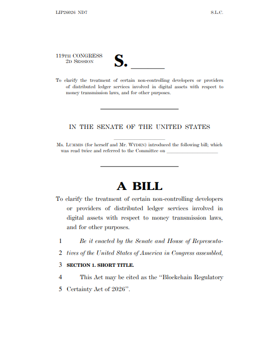 该法案由怀登与鲁米斯参议员提出,旨在为不涉及用户资金管理的开发者豁免汇款监管要求。此举可降低法律不确定性,促进BlockDAG与DeepSnitch AI等早期项目发展。