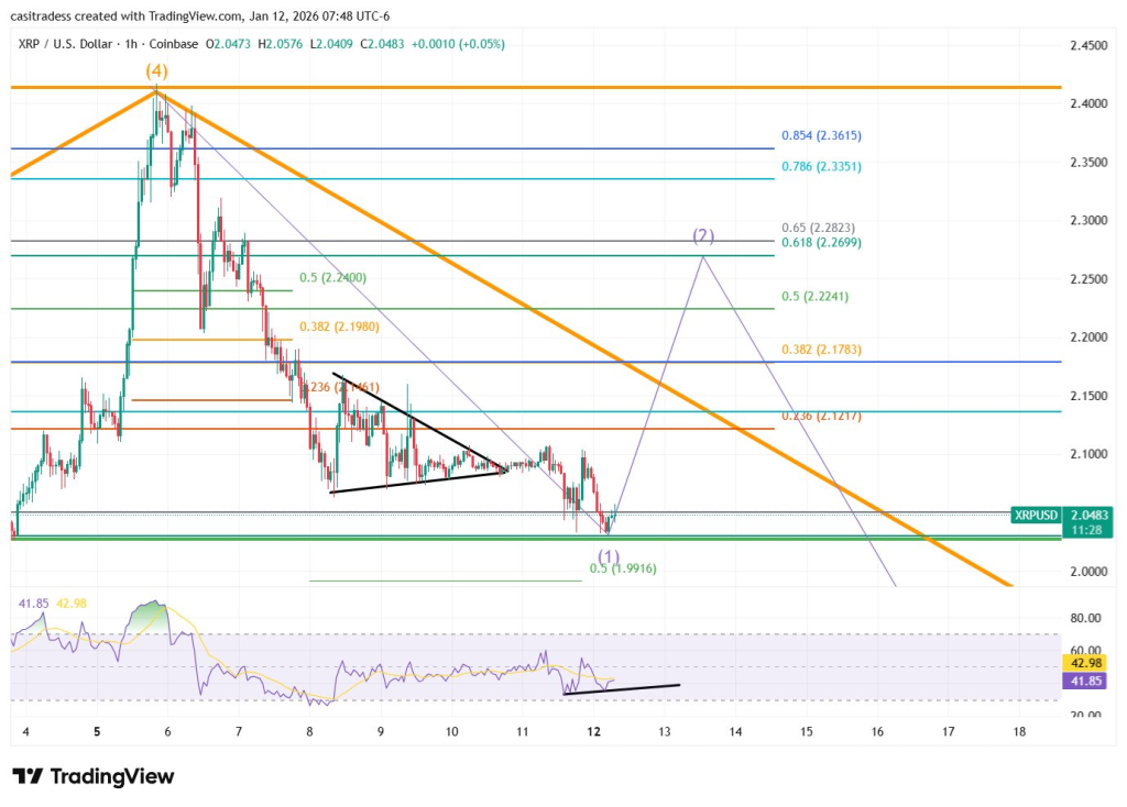 指出此次对宏观支撑的触及精准而非偶然——XRP价格几乎完美守住了该水平,表明买盘正在此区域蓄力。尽管如此,图表结构仍显示更广泛的下跌趋势:高点逐步下移,下降阻力线持续压制价格。